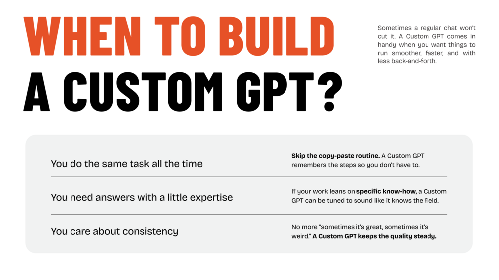 This deck walks you through Setup, build and refinement so you can turn raw ideas into a working GPT that saves you time, keeps responses consistent, and scales your work without extra back-and-forth.